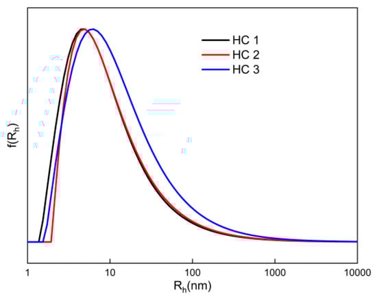 Size distributions from DLS analysis performed in THF at c = 10−2 g/mL for the different HC polymers.