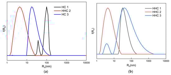 Comparison of size distributions from DLS analysis of the (a) HCs after 24 h hydrolysis in aqueous media and (b) the HHCs in aqueous media. (c = 5 × 10−4 g/mL).