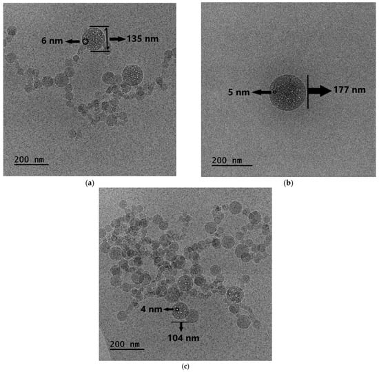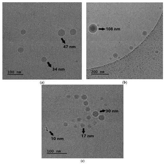 Cryo-TEM images from HHC 3:LYZ = 1:1 complexes showing NPs of (a) Rh ≤ 135 nm, (b) Rh = 177 nm and (c) Rh ≤ 104 nm.