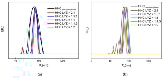 Comparison of size distributions from DLS analysis of the HHC–LYZ complexes obtained from (a) HHC 2 and (b) HHC 3 copolymers.