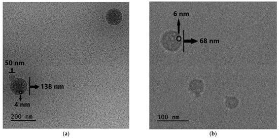 Cryo-TEM images from HHC 3:LYZ = 1:1.5 complexes showing NPs of (a) Rh ≤ 138 nm and (b) Rh ≤ 68 nm.