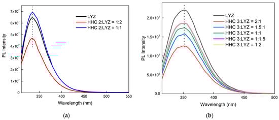 Fluorescence spectra of HHC–LYZ complexes for (a) HHC 2 and (b) HHC 3 copolymers.