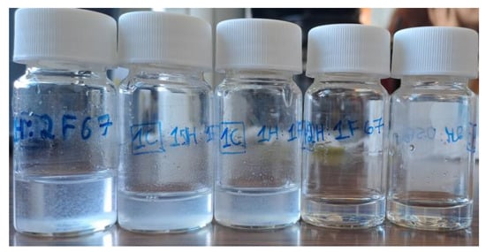 An Artemia salina brine shrimp lethality bioassay was performed as an adaptation of the protocol proposed by Rashidzadeh et al. []. The upper limit of the salinity range (37 ppt) was used to prepare artificial seawater []. Dried cysts (700 mg) were suspended in artificial seawater, which was prepared with the dilution of NaCl in bottled mineral water (1 L). A 48 h incubation period at a temperature of 28 °C, under conditions of strong aeration was carried out. Fluorescent light was utilized for continuous illumination to conform the phototactic nature of the larvae (nauplii). Nauplii were added to the 96-well plates and incubated at 28 °C for 24 h. Each well held 250 μL of the medium, to which 10 μL of the polymer solution—corresponding to a 0.61 M final salt concentration—was added. The numbers of surviving nauplii in each well were counted under a stereoscope after 18 h and 24 h, based on the 10 s rule of no mobility. The control groups contained the same volume of artificial seawater. The experiment was conducted in fours for each concentration. The lethality was calculated using Abbott’s formula. The findings were then averaged to obtain the results reported.