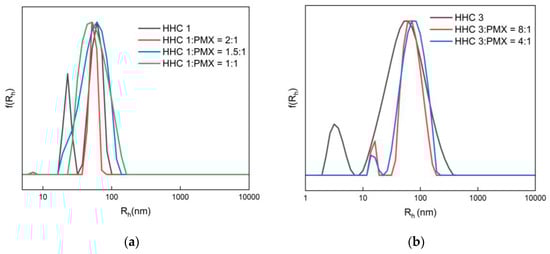 Comparison of size distributions from DLS analysis of the HHC–PMX complexes obtained from (a) HHC 1 and (b) HHC 3 copolymers.