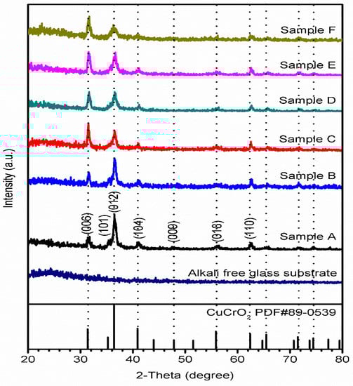 - Han, M.; Wang, J.; Deng, Q.; Wang, J.; Li, W.; Zhang, P.; Li, C.; Hu, Z. Effect of annealing temperature on structural, optoelectronic properties and interband transitions of CuCrO2 nanocrystalline films prepared by the sol-gel method. J. Alloys Compd. 2015, 647, 1028–1034. [Google Scholar] [CrossRef]