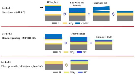 Planar optical waveguides are key structures where the light is confined and transmitted by obeying total internal reflection (TIR). For SiC waveguides, it is indispensable to form an index contrast where SiC has a higher refractive index than the surroundings. At the beginning of this research, floating SiC in the air has been applied because the commercial SiC epilayers on Si substrates were available. Since Si has a higher refractive index than SiC, it has to be removed near the SiC waveguides. But this structure has restrictions on the post-etching process, such as patterning and top-cladding deposition. Instead, silicon carbide on insulator stacks is developed and applied in most of the publications currently. There are generally three different methods to form SiCOI, as shown in Figure 1. For method 1, smart/ion cut method is adopted from silicon-on-insulator (SOI) stack’s formation, where Si wafer is replaced by a SiC wafer [24,25]. But since SiC and Si have very different physical properties, the material loss in SiCOI is still quite high compared to SOI, after ion implantation. This method mainly delivers 4H SiCOI stacks. For method 2, the bonded SiC is thinned down directly by using grinding and later chemical mechanical polishing (CMP) to smoothen the surface. In this way, the ion implantation step in the smart/ion cut is skipped and SiCOI stacks achieve very low loss. This method delivers 4H and 3C SiCOI stacks. For method 3, amorphous SiC is directly deposited on the Si substrate with an SiO layer between. The amorphous SiC deposition could be completed through plasma-enhanced chemical vapor deposition (PECVD) and sputtering. Both methods are CMOS compatible.
