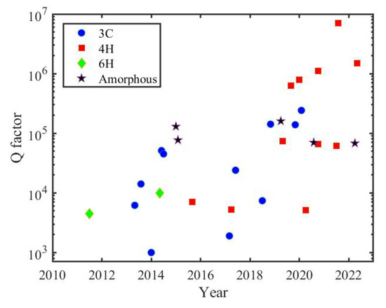 where n is the modal refractive index, V is the mode volume, and = , where accounts for coupling from the pump mode to the waveguide, is the nonlinear refractive index and is the angular frequency [38]. For SiC, three types of optical cavities have been published: photonic crystal cavities (PhC), microring resonators (MRR) and microdisk resonators (MDR). Their evolvement during the past ten years is shown in Figure 2.
