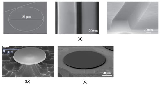 Scanning electron microscope images of (a) 4H SiCOI MMR, reprinted with permission from [36] ©The Optical Society, (b) 3C SiC MDR [59], and (c) 4H SiCOI MDR [56].