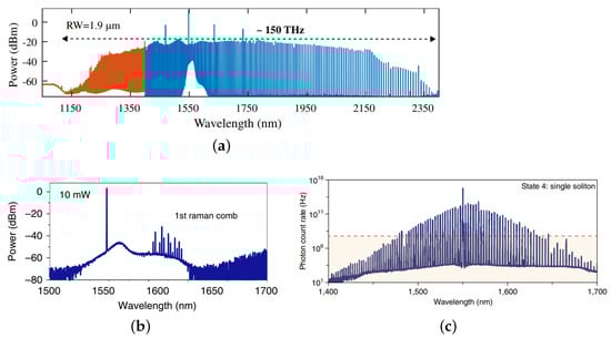 Experimental spectra of (a) octave-spanning Kerr frequency comb reprinted with permission from [57], (b) Raman comb, reprinted with permission from [56], and (c) quantum soliton comb, reprinted with permission from [71] in SiC microresonators.