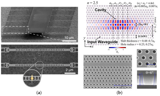 Scanning electron microscope images of (a) 1D photonic crystal nanobeam cavities, reprinted with permission from [52] and (b) 2D photonic crystal heterostructure cavity, reprinted with permission from [50] ©The Optical Society.