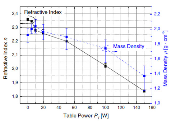 Evolution of the refractive index (left) and the density (right) as a function of the power applied on the substrate measured by Frischmuth team [83]. Reprinted with permission from Elsevier.