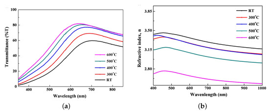 Evolution of (a) the transmittance and (b) the refractive index as a function of the temperature of the substrate, after Seo team [104]. Reprinted with permission from Elsevier.