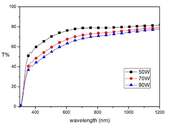 Evolution of the transmittance of SiC films in function of the RF power, measured by Wang [105]. Reprinted with permission from Elsevier.