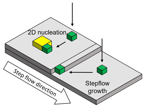 Additionally to CVD heteroepitaxy on Si, cubic SiC can be grown heteroepitaxially on hexagonal SiC substrates in either a CVD or physical vapour transport (PVT) setup. Using SiC as starting material enables higher growth temperature of up to 2000 °C and reduces the lattice mismatch as well as the difference in thermal expansion between substrate and epitaxial layer. For both cases (CVD and PVT), a (0001) orientated SiC substrate is usually used as a starting point, which will result in a (111) orientated 3C SiC top layer by “pseudomorph growth” [130]. During homoepitaxial growth of hexagonal SiC polytypes “step-controlled epitaxy” is preferred to ensure stable reproduction of the substrate polytype during growth [131,132,133]. Conditions favoring this growth regime are a low supersaturation at the growth surface as well as high off-axis angles (3–8) resulting in a high number of atomic growth steps. The high step density and small terrace width, respectively, lead to a migration of adatoms towards step edges where they reproduce the substrate polytype during incorporation into the crystal. For the nucleation of 3C SiC on the hexagonal substrate, the growth conditions have to be tweaked from the nominal step flow towards the formation of 2D nucleation on the growth terraces. This growth regime can be promoted if the probability of adatoms reaching a growth step is reduced by either lowering of the growth temperature, increasing the terrace width by growth on “on-axis” substrates or increased supersaturation. A schematic scheme of the two growth modes are depicted in Figure 10.