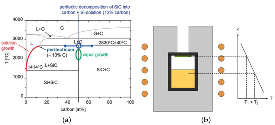 (a) Phase diagram of Si and C. (b) Schematic setup of a typical PVT growth cell and isolation. With permission from [154].