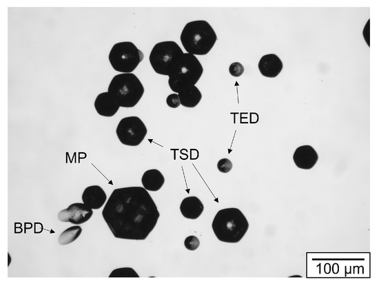 Figure 15 depicts a typical SiC wafer surface etched with molten KOH. All main defect types are shown. The BPD exhibits a characteristic elongated etch pit since the dislocation line lies perpendicular to the growth direction. BPDs are only visible in KOH-etched samples if there is a slight off-axis angle in respect to the (0001)-plane. TEDs are expressed by a small circular etch pit while TSD etch pits have a more pronounced hexagonal shape. In Figure 15, you can see several sizes of TSD etch pits. The reason for that lies in the different values the burgers vectors of TSDs can assume. It was demonstrated that TSDs exist with burgers vectors b ≤ 3c [165]. The different sizes of the TSDs in the depicted KOH-image most likely correlate to different amounts of b. The largest etch pits belong to MPs. Since MPs are essentially TSDs with an open core and burgers vectors b ≥ 3c [166], the etch pit looks up-scaled but similar. The overlap between MPs and TSDs at 3c means that, without directly observing the open core of MPs, it is very difficult to differentiate between a 3c MP and a 3c TSD in a KOH etching image. Other defect characterization methods worth mentioning are photoluminescent mapping, X-ray topography or Raman spectroscopy. A more extensive overview can be found in [167].