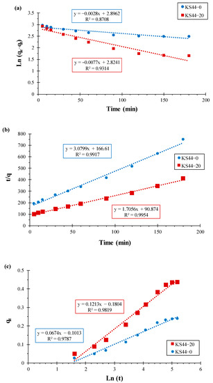 Kinetic parameters of the pseudo-first-order (a), pseudo-second-order (b) and the Elovich model (c) for RhB adsorption on KS44-0 and KS44-20.