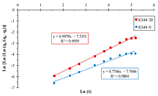 The kinetic parameters for the adsorption of RhB onto carbon composites were determined using the slope-intercept form (Figure 5) and are summarized in Table 3. The graphical representation of qt versus t1/2 that describes model dependencies obtained for RhB dye adsorption (Figure 5) did not pass through the origin. Next, there were two separate linear regions independently evaluated in both cases. From this figure, it is evident that intra-particle diffusion is a significant step in the process of the adsorption of RhB onto KS44-0 and KS44-20, especially in the first 60 min of the experiment. Figure 5 shows a linear plot of kinetic data, not passing through the origin, which indicates that the diffusion of adsorbate into the pores of adsorbents is not the only rate-controlling step. Nonetheless, the Bangham plot’s linearity indicates that more than one process may be at work when it comes to the uptake of RhB onto carbon composite materials (Figure 6). As indicated in Table 3, the correlation coefficients (R2) of the intra-particle diffusion and the Bangham model converge to 1, which indicates the applicability of these two adsorption kinetic models. Thus, the intra-particle diffusion model, which is highly supported by the Bhangam model, is the second-best model to produce a decent match to the experiment, followed by a pseudo-second-order. This suggests that the data fit and mainly control the adsorption process of RhB onto carbon composites with three kinetic models for all experimental conditions.