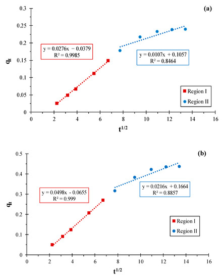 Intra-diffusion kinetic model representation for RhB adsorption on (a) KS44-0 and (b) KS44-20.