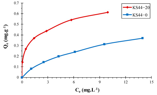 The adsorption isotherms of RhB dye on KS44-0 and KS44-20 composites at room temperature were studied (Figure 7). Indeed, the adsorption isotherm describes the interaction of dyes with adsorbents, which are determinant factors for the performance of adsorption processes. According to the concentration of adsorbate remaining in solution Ce (in mg.L−1), it expresses the amount of adsorbate on the adsorbent qe (in mg.g−1 of adsorbent). The adsorption isotherms indicate that the amount of adsorbed RhB increased with the increase in initial concentration Ce. The results demonstrate that the adsorption occurred quickly in the early stages of the experiment before processing slowed down to reach a plateau, a sign that porous composite surfaces are saturated. In the low Ce range, the adsorption of RhB adsorbent on KS44-20 was closer to the theoretical line, corresponding to 100% adsorption, which suggests a higher binding affinity of RhB dye onto KS44-20.