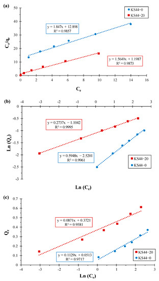 Transformed adsorption isotherm for (a) the Langmuir model, (b) the Freundlich model and (c) the Temkin model for RhB adsorption on KS44-0 and KS44-20 composites.