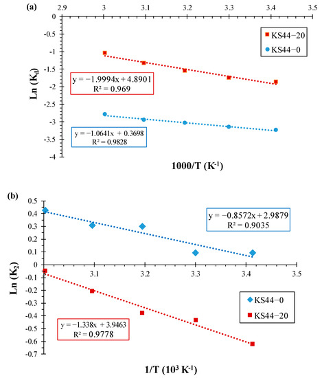 The influence of temperature on the retention rate of the RhB dye on the adsorbents (KS44-0 and KS44-20) is illustrated in Figure 9a. According to the adsorption theory, the adsorption rate and adsorption capacity increase with the increase in temperature (from 20 °C to 60 °C). In accordance with the first law of thermodynamics, this phenomenon does not only suggest that the reaction of RhB dye adsorption on composites is endothermic (ΔH°ads > 0), but also explains why reactions occur more rapidly at higher temperatures [38,39].