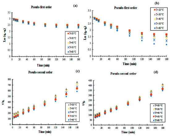 Pseudo-first-order and pseudo-second-order models plot for RhB at different temperatures onto (a,c) KS44-0 and (b,d) KS44-20.