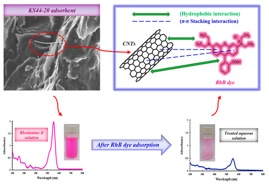 It is worthwhile mentioning that RhB dye solution has two primary distinctive absorption bands (Figure 11). The ultraviolet (UV) light spans a range of wavelengths between 200 and 400 nm, which represents the aromatic rings of RhB (π → π* transition of C=C, C=O and C=N groups). The visible radiation bands at 555 nm (n → π* transition of C=N and C=O groups) are attributable to the color of dye solution, which was used for the monitoring of dye decolorization [55]. The high adsorption performance of the carbon graphite/carbon nanotube composite material towards RhB dye might be explained by the feasible adsorption mechanism involved in the adsorption process (Figure 11). This startling discovery is especially pertinent to the π–π stacking interactions, which corresponds to a very small binding energy between the aromatic backbone of the RhB dye molecules and the large delocalized π-electrons over the entire hexagonal skeleton of carbon graphite and carbon nanotubes [56,57,58,59]. Moreover, the observed porosities emanate from the pores available for RhB dye uptake, which further enhances the absorption capacity in the carbon composites. These pores provide excellent surfaces for trapping and thus favor the RhB dye molecules’ adsorption [60,61,62].