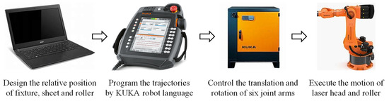 QP1180 steels prepared by a two-step quenching and partitioning process by BaoSteel were investigated in this study. The as-received, 1-mm-thick metal sheets consisted predominantly of martensite, ferrite, and retained austenite [19]. QP1180 steel sheets were cut into 250 mm × 60 mm strips by laser cutting; afterwards, the strips were clamped onto the fixture and ready for the subsequent forming procedure. An LRRF process was applied to bend the strips into nearly 90-degree L-shaped parts by multiple forming passes [4,20]. The schematic of LRRF and the corresponding experimental facilities can be found in Figure 1. In the LRRF process, a high-power laser source is imposed 25 mm in front of the roller to preheat the strips to an elevated temperature, followed by the mechanical bending via the direct contact between the roller and the strips. The laser head and the forming roller are driven by one six-axis heavy-duty industrial robot (KR600, KUKA, Augsburg, Germany) to realize synchronous motion. The trajectories of the roller are firstly designed according to the relative position of the fixture, sheet, and roller, and then they are embedded into the KUKA smartPAD teach pendant using the KUKA robot language (KRL). The programmed trajectories are defined by the translation and rotation of a local Cartesian coordinate system, which is introduced at the end of the roller, relative to the global Cartesian coordinate system. The system controller is then capable of manipulating the motion of joint arms with six degrees of freedom (DOF). The flow chart of the process is shown in Figure 2.