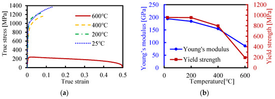 The thermo-mechanical properties of QP1180 steels were obtained by high-temperature quasi-static tensile tests at an MTS universal testing machine and the strains during tensile tests were captured with the aid of a digital image correlation (DIC) technique. Figure 5 demonstrates the flow curves and the mechanical properties of QP1180 at the temperatures of 25, 200, 400, and 600 °C. It was found that Young’s modulus and yield strength of QP1180 decrease with an increase in temperature, and a significant decrease is observed at the temperature range of 400–600 °C. The yield strength of QP1180 at 200 °C is almost identical to that at room temperature, indicating the dominant deformation mechanism of slip activity at this temperature range [22]. It is also interesting to note that the elongation and ultimate tensile strength of QP1180 decreases at 200 and 400 °C compared to that at room temperature; this is due to the fact that the transition from retained austenite to martensite is restricted at elevated temperatures, while the transformation induced plasticity (TRIP) effect is more prone to occur at room temperature [23]. QP1180 steels exhibit favorable elongation at 600 °C, which may be related to dynamic recovery and recrystallization at this temperature; in addition, an obvious softening effect was also notable at 600 °C, while a hardening effect still dominates below 400 °C.