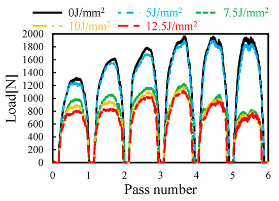 The forming forces at each forming pass during LRRF are presented in Figure 6. The results indicate that there is no significant difference between forming with a laser power density of 5 J/mm2 in comparison with forming without laser heating. However, a remarkable decrease of ~43% in forming forces is notable when forming at a laser power density of more than 7.5 J/mm2. Besides, increasing laser power density above 7.5 J/mm2 has a negligible influence on the peak forming forces. The decrease in forming forces also reduces the demand on the load capacity and stiffness of the industrial robot and thus saves investment costs on the facilities. In addition, the laser power-density threshold between 5 J/mm2 and 7.5 J/mm2 also provides inspiration for the process optimization with limited laser energy. It was also found that the peak forming forces increase at the first four forming passes and then maintain or decrease levels for the last two forming passes. The increase in forming forces should be attributed to a larger plastic deformation with the cumulative forming passes in comparison to the participation of elastic deformation at the initial deformation stages, and the adequate softening effect at the last two forming passes might account for the constant or descending peak forming forces.