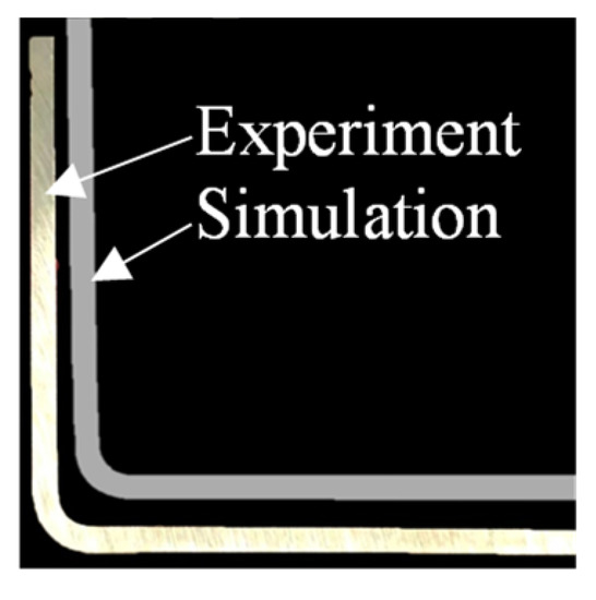 The predicted bending profile with a laser power density of 10 J/mm2 is given in Figure 8 together with the experimental profile. The predicted bending profile agreed with the experiments, and the deviations of the R/t ratio and springback angle was about ~15% and 0.2°, respectively.