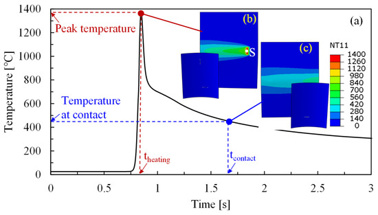 where d is the distance between laser spot and roller, and v indicates laser scanning speed, which is also the moving speed of the roller. Consequently, the temperature history at laser spot center in Figure 9b was extracted from the FE model and then presented in Figure 9a. The temperature vs. time curve suggests a higher cooling rate at higher temperatures, and the temperature at tcontact is about 450 °C, although the peak temperature reaches ~1370 °C at theating. The temperature value at tcontact also implies the minimum forming temperature since the largest bending angle is achieved at tcontact by the direct contact between the roller and this position. Therefore, forming can be regarded as taking place at the time intervals between theating and tcontact or within the temperature range between peak temperature and temperature at contact in Figure 9a. It is, of course, possible to tune the time intervals or temperature ranges by altering the distance between the laser spot and roller or the scanning speed, as suggested in Equation (2); however, this is beyond the scope of this study.