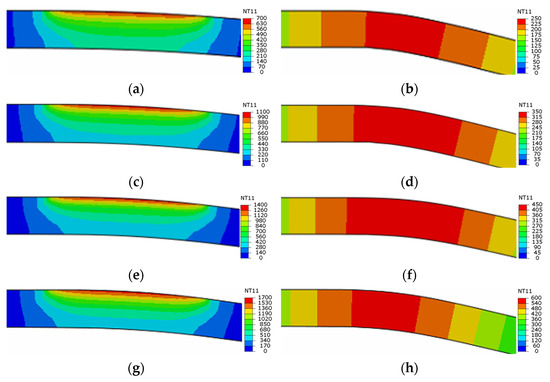 Cross-sectional temperature field of metal sheets formed at laser power densities of 5 J/mm2 (a,b), 7.5 J/mm2 (c,d), 10 J/mm2 (e,f), and 12.5 J/mm2 (g,h). Here (a,c,e,g) indicate temperature fields at theating, and (b,d,f,h) denote temperature fields at tcontact.