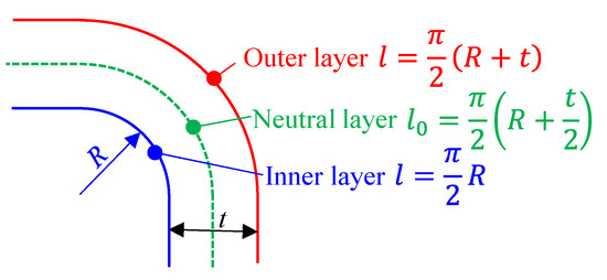 where l is the length of the outer and inner layer after deformation and l0 is the initial length of outer and inner layer, or the length of a neutral layer (not changed ideally), as shown in Figure 12. Although the actual bending process can slightly differ in thickness variation or neutral layer shifting, this equation still suggests that larger strains are always required to form thin-walled parts with smaller R/t ratios, which is more likely to happen in LRRF due to the softening effect of laser heating.