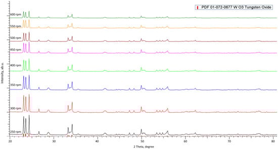 Characterization of the stability of the phase composition of the selected ceramics depending on the grinding conditions was carried out using the X-ray phase analysis method implemented on a D8 Advance ECO powder diffractometer (Bruker, Berlin, Germany). X-ray diffraction patterns were taken in the range 2θ = 20–80°, with a step of 0.03°. Figure 1 shows X-ray diffraction patterns of the studied ceramic samples after grinding at different grinding speeds.