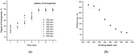 (a) Results of the homogeneity degree depending on the grinding conditions; (b) Results of particle size changes depending on the grinding speed.