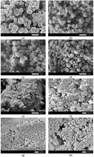 SEM images of the obtained ceramics depending on the grinding speed: (a) 250 rpm; (b) 300 rpm; (c) 350 rpm; (d) 400 rpm; (e) 450 rpm; (f) 500 rpm; (g) 550 rpm; (h) 600 rpm.