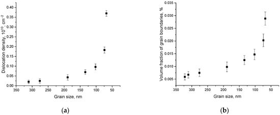 As can be seen from the data presented, the greatest change in size affects the change in dislocation density, which, when the grain size decreases to 100 nm, leads to a sharp increase in dislocation density (more than five times higher than the change in the volume fraction of grain boundaries). These differences can be explained by the fact that as the grain size decreases, the dislocation density, which has an inversely quadratic dependence on the size, sharply increases due to the small size, while the volume fraction has a more complex size dependence, which also includes the dimensions of the boundaries themselves.