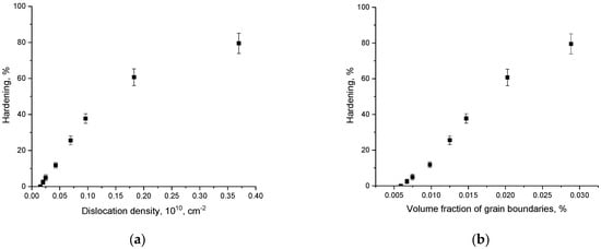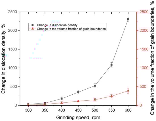 Figure 7 shows the dependencies of the hardening coefficients on the density of dislocations and the volume fraction of grain boundaries, which were calculated based on changes in grain sizes (see data in Figure 4a,b). As can be seen from the presented data, with small changes in grain sizes (at low grinding speeds), the greatest contribution to hardening is made by the effects of changes in dislocation density, while at small grain sizes, the main contribution to hardening is made by the effects associated with the volume fraction of grain boundaries.