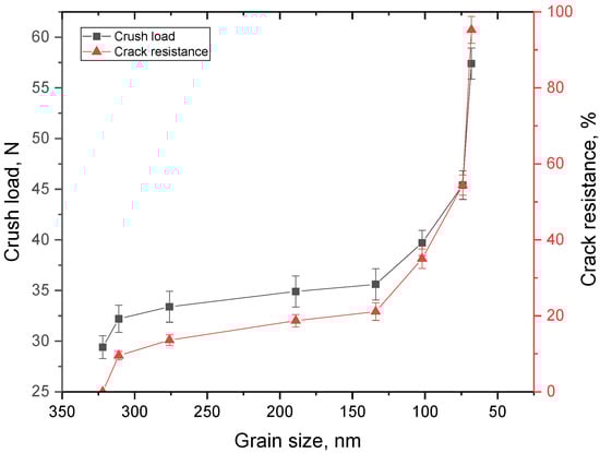 As can be seen from the data presented in Figure 8, in contrast to the change in hardness values, the most pronounced changes in crack resistance are observed with a decrease in size below 150 nm. At the same time, in the case of a decrease in size to 50–70 nm, it leads to an increase in crack resistance up to 80% in comparison with similar values for ceramics consisting of large grains. Such a difference in the nature of changes in the hardness of ceramics and their resistance to cracking can be explained by the fact that, during compression, cracks propagate along grain boundaries, which, in the case of small sizes, are quite numerous, and the rate of propagation of microcracks sharply decreases. When determining the hardness, resistance to pressure is exerted by dislocations, the density of which changes significantly even with a slight decrease in grain size (inverse quadratic dependence).