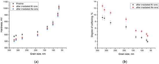 (a) Results of changes in the hardness of the near-surface layer before and after irradiation; (b) Results of changes in the near-surface layer softening value as a result of irradiation.