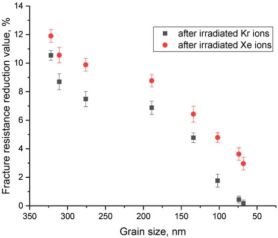 To determine the efficiency of reducing the grain size of ceramics to increase resistance to radiation damage, the following experiment was carried out. Samples with different grains were irradiated with heavy Kr and Xe ions with energies of 150 and 230 MeV, respectively, with an irradiation fluence of 1015 ion/cm2. According to the results of several experimental works [27,34,35], this corresponds to the formation of highly defective regions in the structure of the damaged layer, which can lead to the destruction of the near-surface layer and its embrittlement. After irradiation, the microhardness values of the near-surface layer and the crack resistance were measured. Results of these experiments are shown in Figure 9. Figure 10 shows the results of assessing the change in the crack-resistance value for ceramics exposed to heavy ion irradiation.