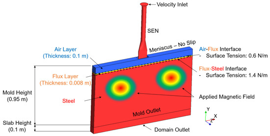 In order to make our model better predict the realistic flow field and the surface wave behavior in the primary cooling process, the geometry model was built based on the actual SEN and mold used by Nucor. The initial flux thickness and depth were also from the measured data of the Nucor caster. The boundary conditions utilized in the simulation are shown in Figure 1. Here, the velocity inlet, , is calculated utilizing the conservation of mass with respect to the density, as shown in Equation (12), where, is the density at the torch cut off temperature, is the density taken at the temperature of the inlet, is the cross section area of the mold, and is the volumetric flow rate of steel. The surfaces of the narrow face, board face, and the mold outlet are set as walls. The prescribed magnetic flux density with respect to position was provided by industry collaborator, Nucor Corporation, and mapped to the mold.