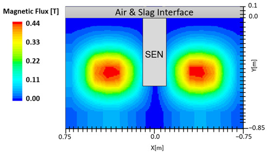Electromagnetic forces generated by the EMBr unit can be applied as either static or moving magnetic fields in the mold. An example of a magnetic field applied in the mold is shown in Figure 2. The electromagnetic fields induced a current in the conducting molten steel, which generated Lorentz forces that oppose the flow and thus are referred to as “brakes” or “EMBr” [12,15]. The simulation utilizes a static EMBr configuration. In a static EMBr configuration, two circular magnetic fields are applied in the center of the mold normal to the broad face [8]. The purpose of this configuration is to dampen the molten steel as it recirculates around the applied EMBr. Electromagnetic forces are noted to offer an advantage over other flow control methods as the induced forces vary in strength, providing a theoretical self-stabilization for turbulent flow variations [3]. A gauss meter is utilized to measure the location and strength of the magnetic field. Per the MHD model, the magnetic field and location are defined in the STAR-CCM+ simulation conducted.