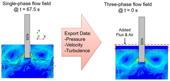 The simulations for the study were conducted in Simcenter STAR-CCM+ 2021.3.1, with a two-step approach, namely single-phase flow and three-phase flow. First, to reduce the computational time and increase the stability of the simulation, a single-phase flow simulation was conducted to develop the flow field. Next, as shown in Figure 4, a three-phase flow field was simulated with the pressure, velocity, and turbulence utilized as the initial conditions from the single-phase simulation output. For the single-phase simulation, the applied magnetic field and the molten steel material properties were defined. Once the flow field was developed, the output, as mentioned, was imported as the initial conditions for the three-phase simulation, incorporating the material properties of the flux and the air layers as well. The surface velocity and the surface wave height extracted from the simulation utilized time-averaged results, averaging the result over the computational time as mentioned in the literature by Liu et al. [18].