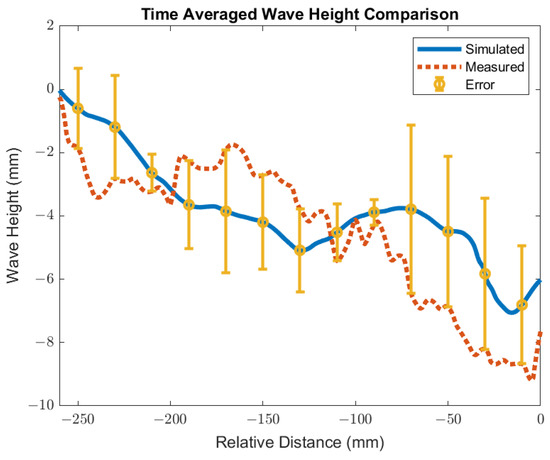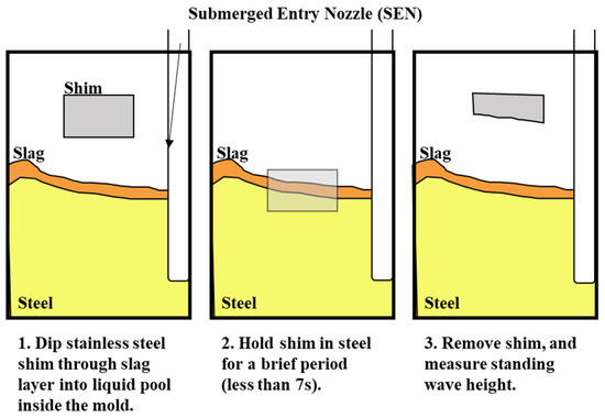 The surface standing wave height generated from the baseline simulation was compared to the shim dip sample taken at the caster for validation. The purpose of the validation was to match the peak heights to validate the trend of the surface wave. The simulation was conducted with an EMBr center strength of 4450 G and casting speed of 3.43 m/min. Under the defined mold design and casting conditions, the height of the surface standing waves was captured and used for validation by measuring the oscillation marks due to the surface fluctuations in the shim dip test. Figure 5 shows the procedures of the shim dip test. A stainless steel shim was dipped in through the slag and into the steel. The portion of the shim that was immersed in the steel would melt. The shim that remained unmelted revealed the shape of the standing wave. The standing wave height was obtained by measuring the remainder of the shim sample. The same conditions were utilized in the simulation and the simulated wave height of the flux layer was compared with the shim dip measurements provided. As shown in Figure 6, the time averaged surface standing wave plotted against the measurements taken at the plant showed high confidence for the simulated results. Per the time averaged results from 10 s to 30 s, there was an average percentage difference of 16%, which showed a 1.58 mm average peak height difference. Per validation, the surface wave matched the trend provided.