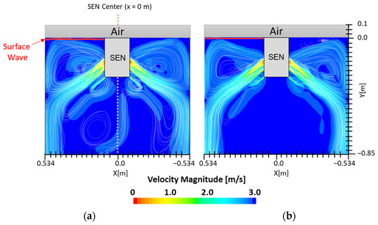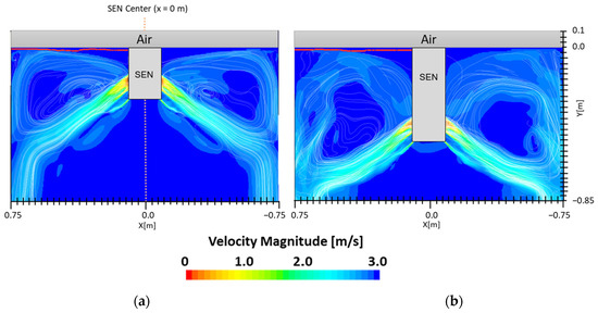 (a) Low SEN depth 110 mm (Case 4) vs. (b) high SEN depth 350 mm (Case 8) flow streamline.