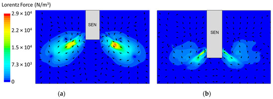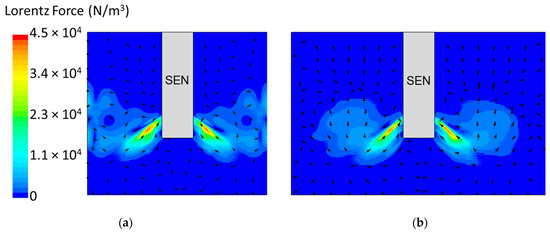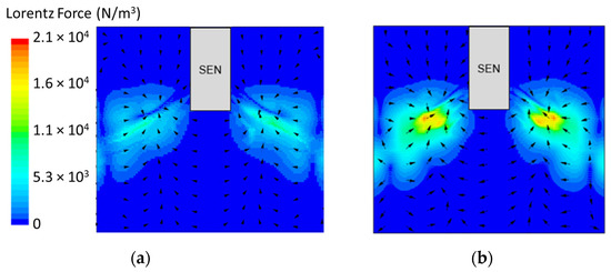 (a) Low SEN depth 110 mm (Case 4) vs. (b) high SEN depth 350 mm (Case 8) Lorentz force distribution.