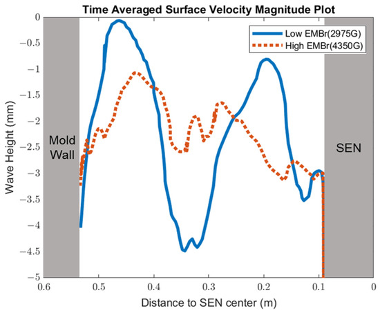 Figure 8 shows the applied Lorentz force due to the EMBr. At a lower EMBr strength, there was less Lorentz force acting on the molten steel, thus the flow was more cluttered towards the upper mold. This ultimately led to a larger fluctuation of the surface standing wave in the lower EMBr case, as shown in Figure 9, because of the larger magnitude of surface velocity and lower Lorentz force acting against the molten steel, as shown in the plot in Figure 10. A larger EMBr strength dampens the flow, and the injected molten steel tends to flow downwards. This is evident when comparing the surface velocity. A larger EMBr strength reduced the average surface velocity magnitude by 15% relative to the lower EMBr strength. When comparing the surface standing wave of Case 1 and Case 2, Figure 9 shows the impact of EMBr strength. Case 2, which had a lower strength of EMBr, has a larger fluctuation of time averaged surface standing wave with a peak height of 4.8 mm and average wave height of 2.4 mm. While the higher strength of EMBr had a peak height of 3.01 mm and average surface standing wave of 2.1 mm. Increasing the EMBr strength from 2975 G to 4350 G decreased the average surface standing wave height by 12.5%.